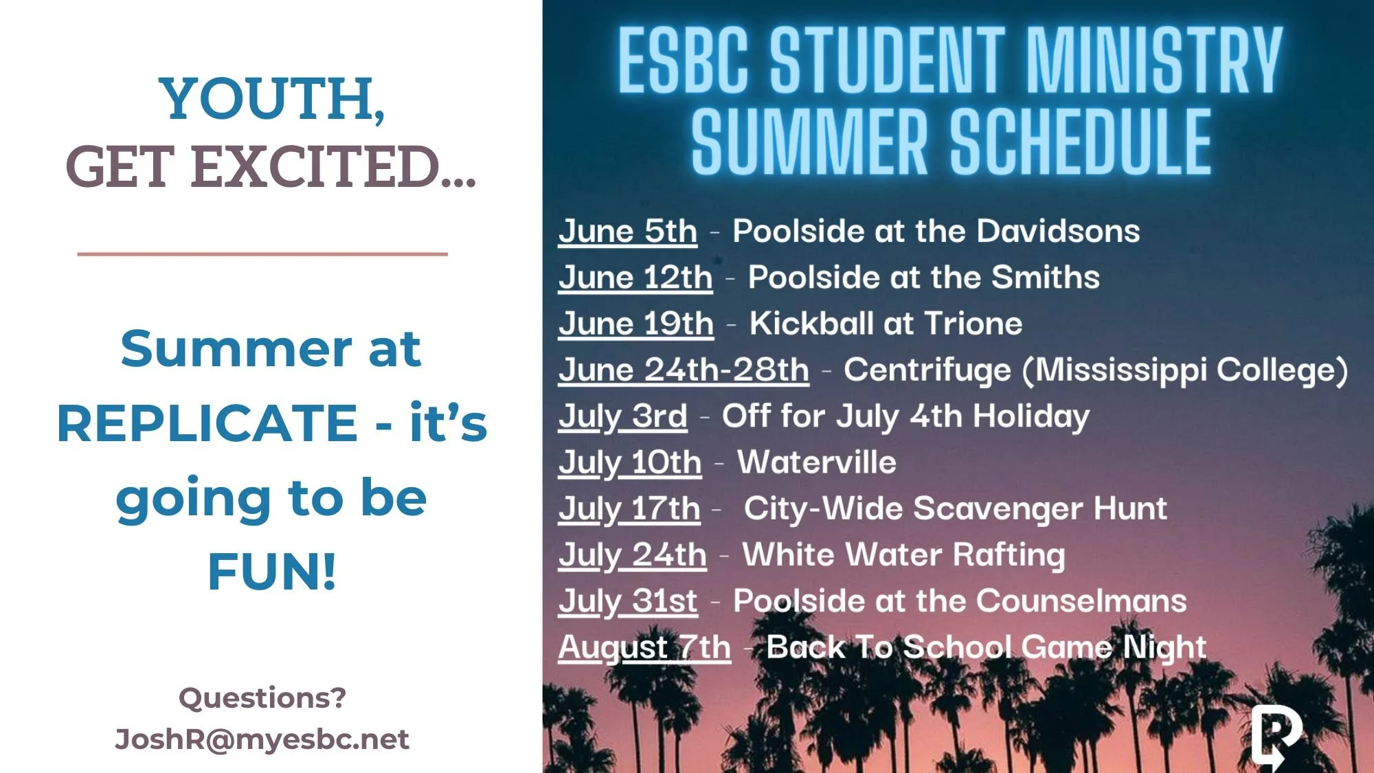 REPLICATE (Wednesdays 6:30-7:30) - Currently, the Replicate service on Wednesday night is streamed live on Facebook and Instagram (replicate_esbc). Everyone is invited to log on.